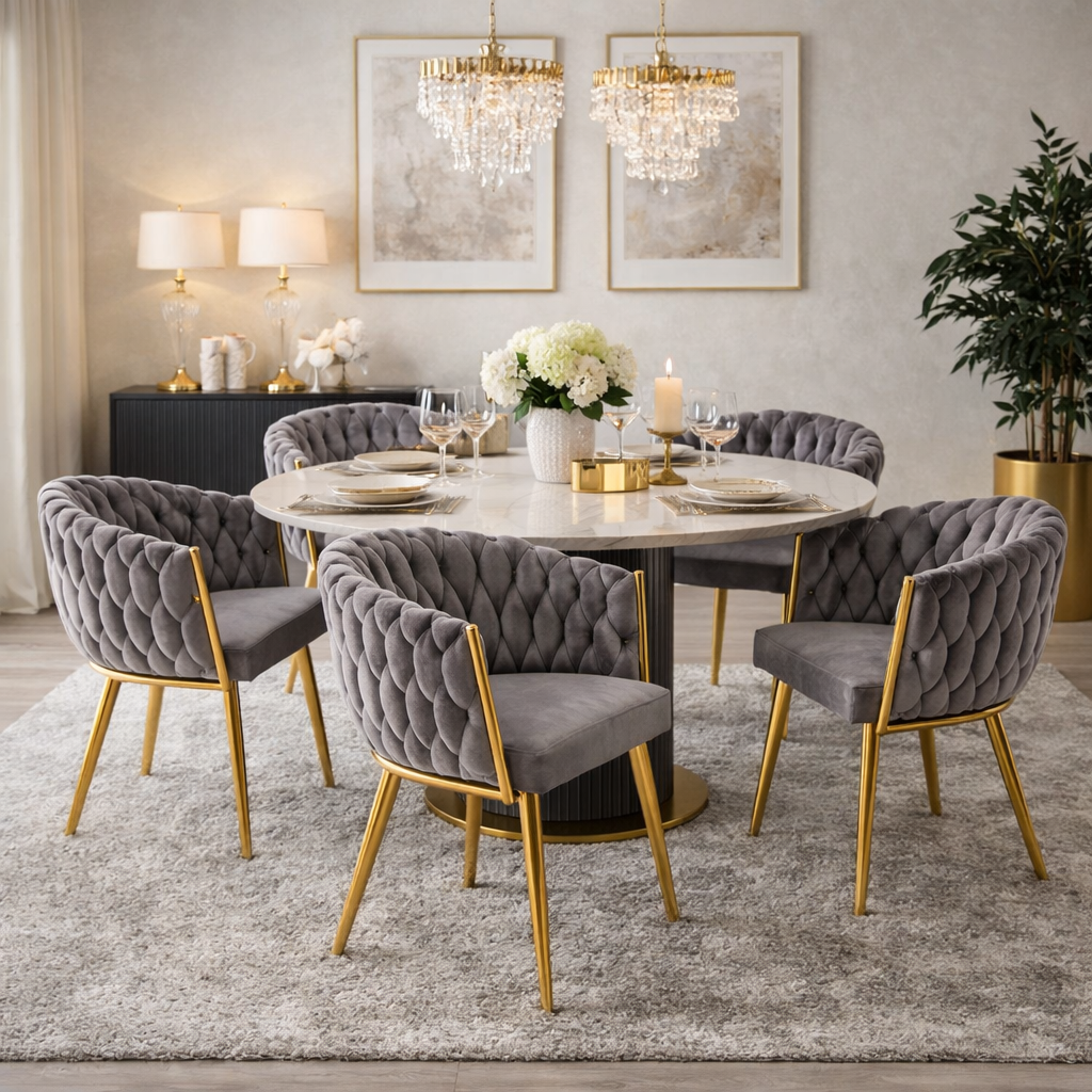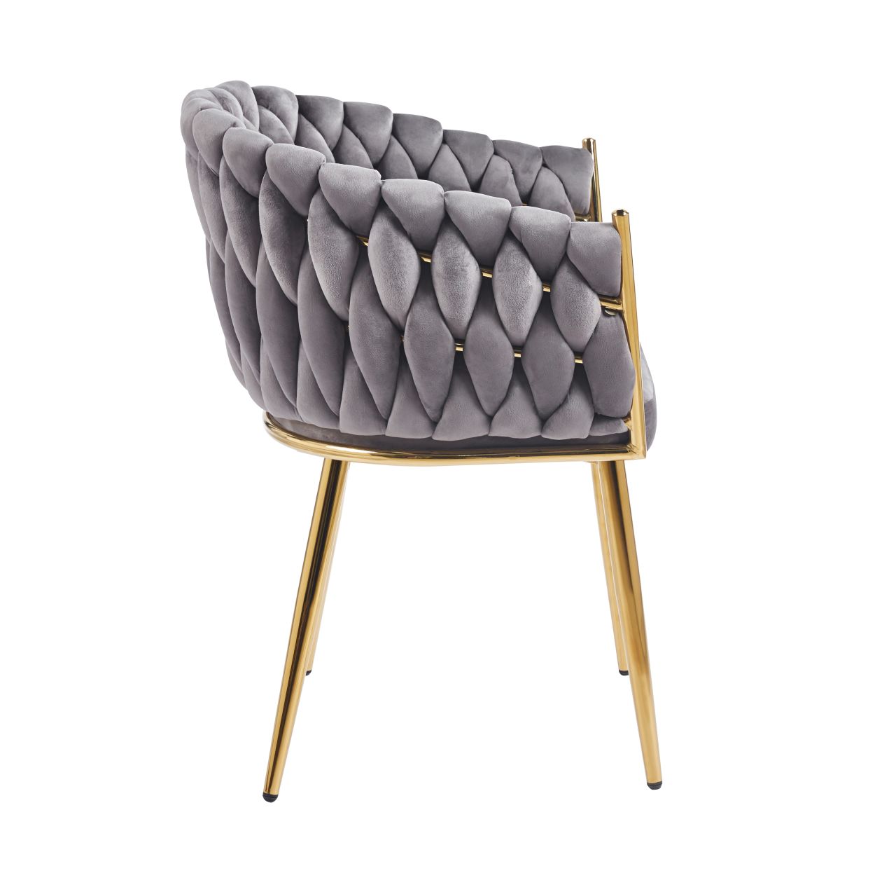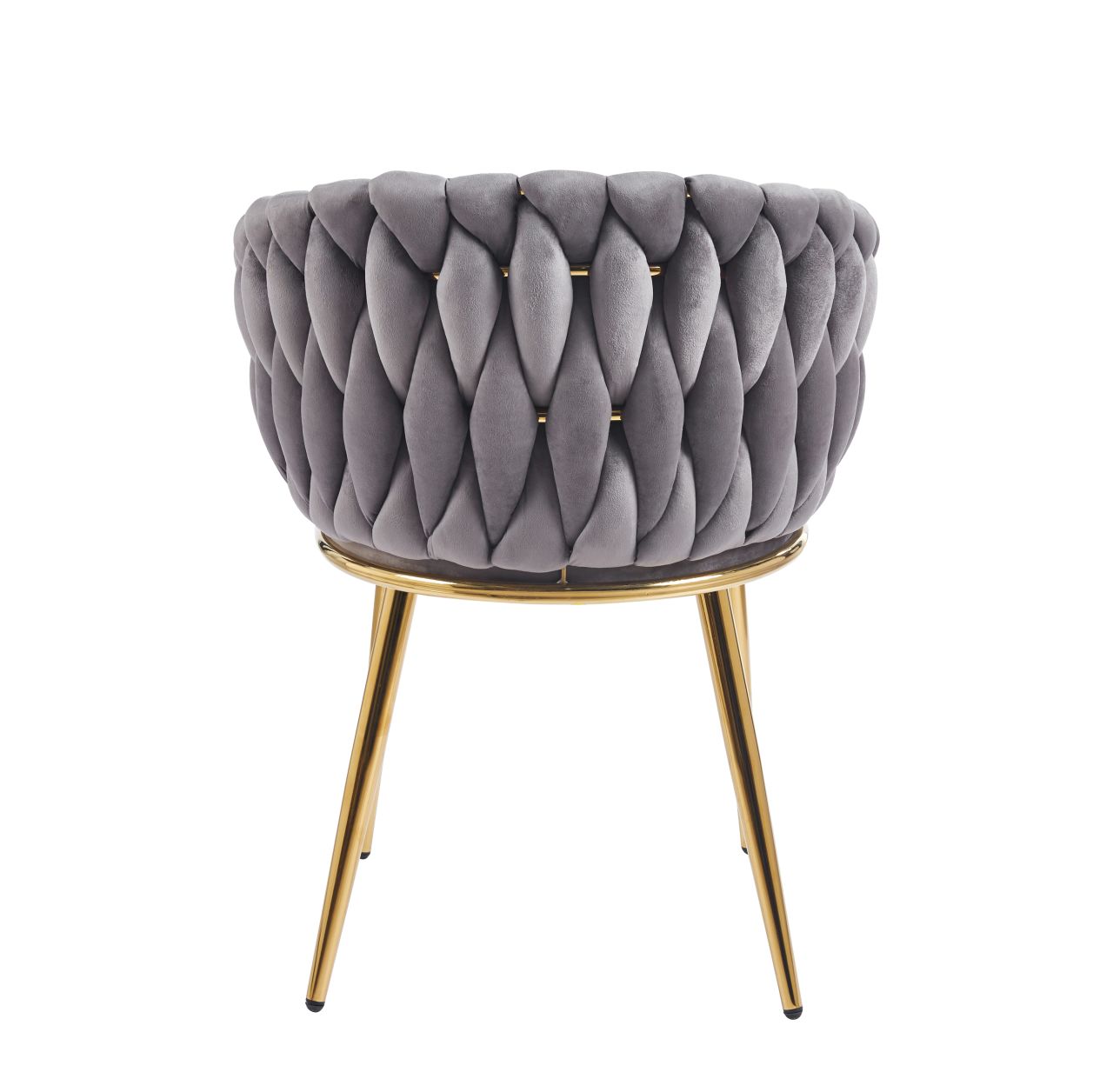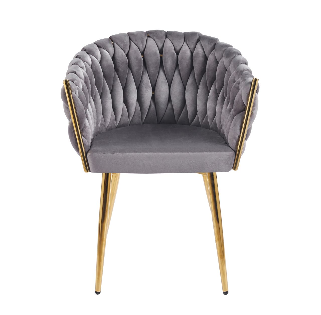 Stabilność krzesła zapewniają złote nogi z chromowanej stali, które podkreślają elegancki charakter mebla. Stylowe pikowanie na oparciu dodaje całości wyjątkowego wyglądu.
