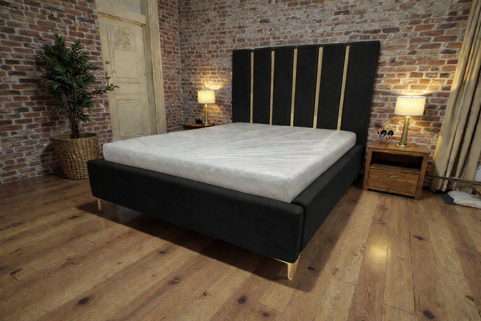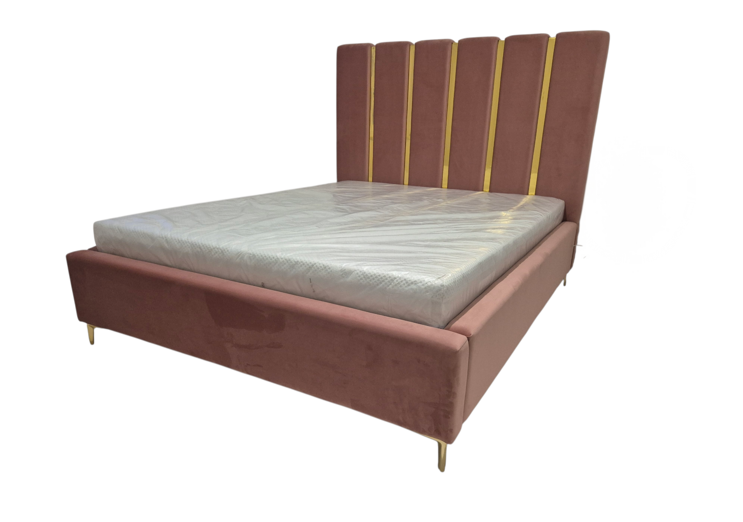 Zagłowie wykonane jest z szerokich paneli, pomiędzy którymi zastosowano ozdobną listwę o szerokości 5 cm. Do wyboru listwa w kolorze złotym, chromowanym lub czarny połysk. Przód oraz boki łóżka tapicerowane są na gładko, co podkreśla nowoczesny styl mebla.