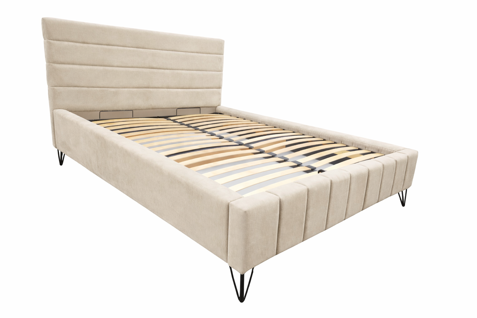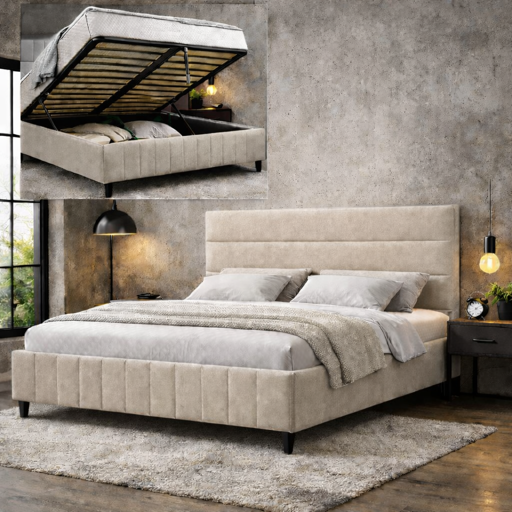 Model powstaje z miękkiej i eleganckiej tkaniny Royal Velvet, która zapewnia komfort i estetyczne wykończenie. Łóżko posiada pojemnik na pościel oraz metalowy stelaż na siłownikach gazowych, co ułatwia codzienne użytkowanie i przechowywanie.