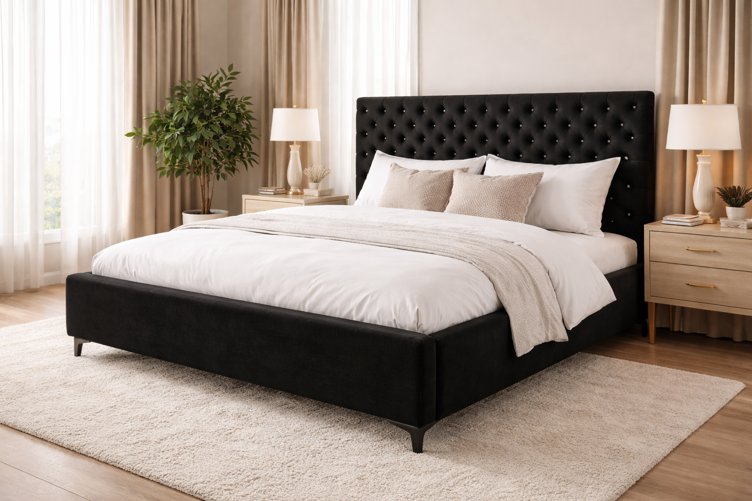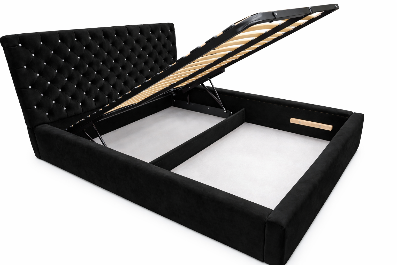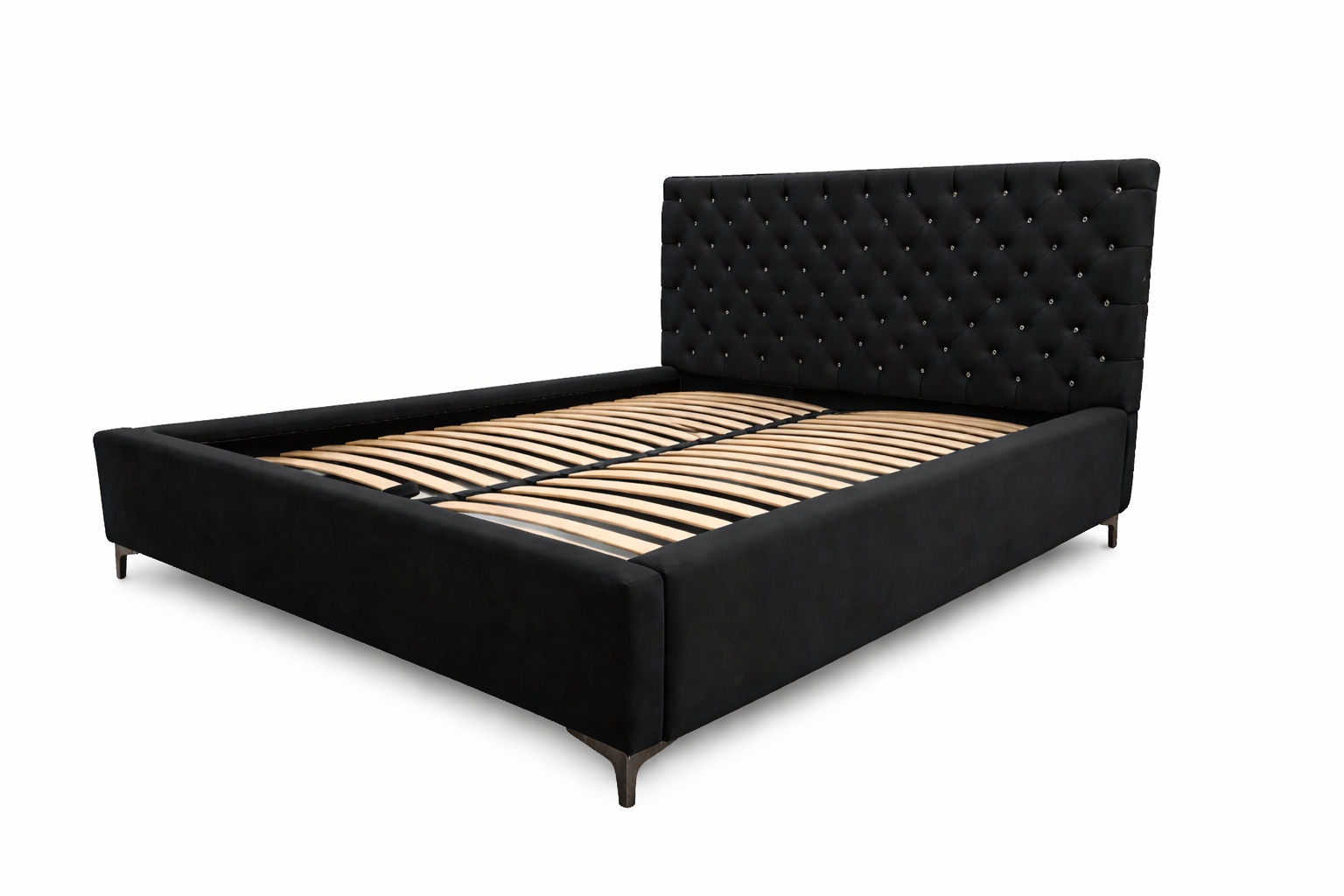Łóżko sypialniane GLAMOUR łączy elegancję stylu chesterfield z funkcjonalnością. Model posiada głęboko pikowany zagłówek, który producent ręcznie ozdabia kryształkami Swarovskiego. Taki detal nadaje łóżku luksusowy i wyjątkowy charakter.