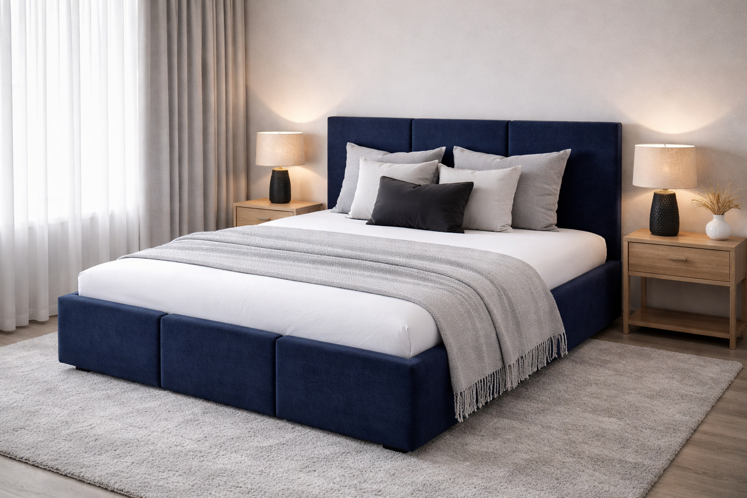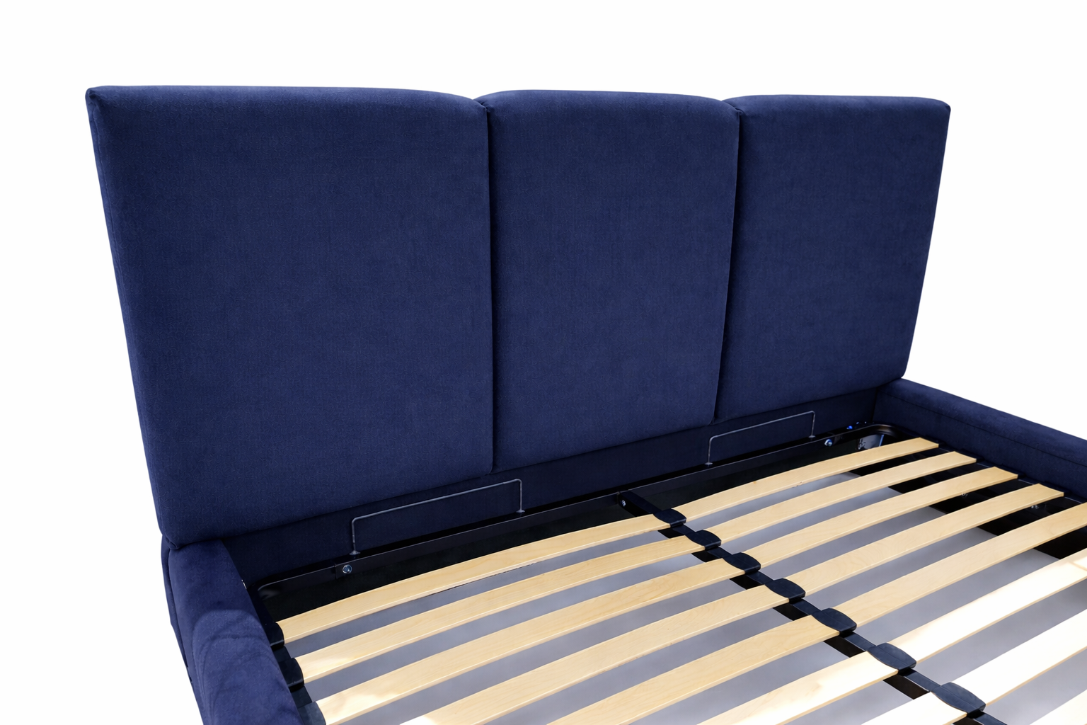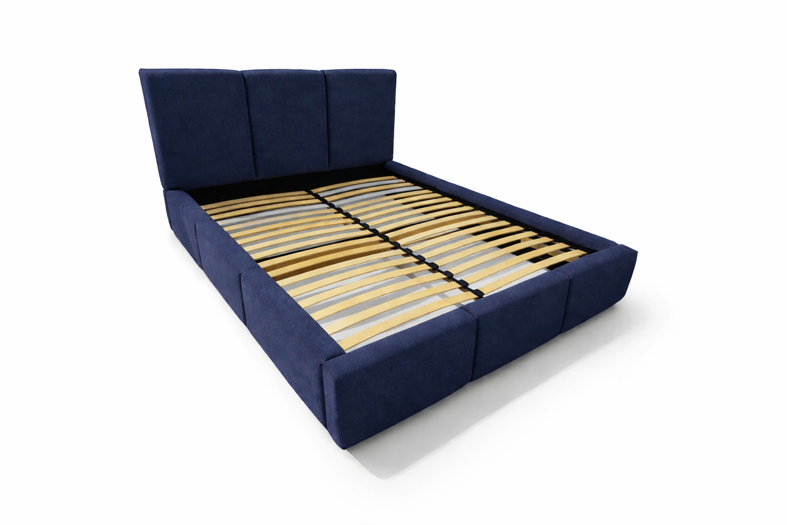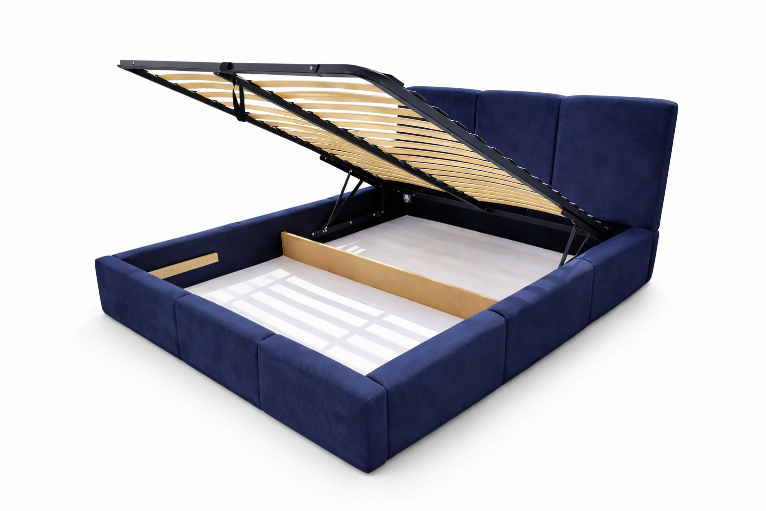Łóżko tapicerujemy przyjemną w dotyku tkaniną Royal Velvet lub Bubble. Model wyposażamy w pojemnik na pościel oraz metalowy stelaż z siłownikami gazowymi, który umożliwia łatwe podnoszenie materaca i wygodne przechowywanie tekstyliów.