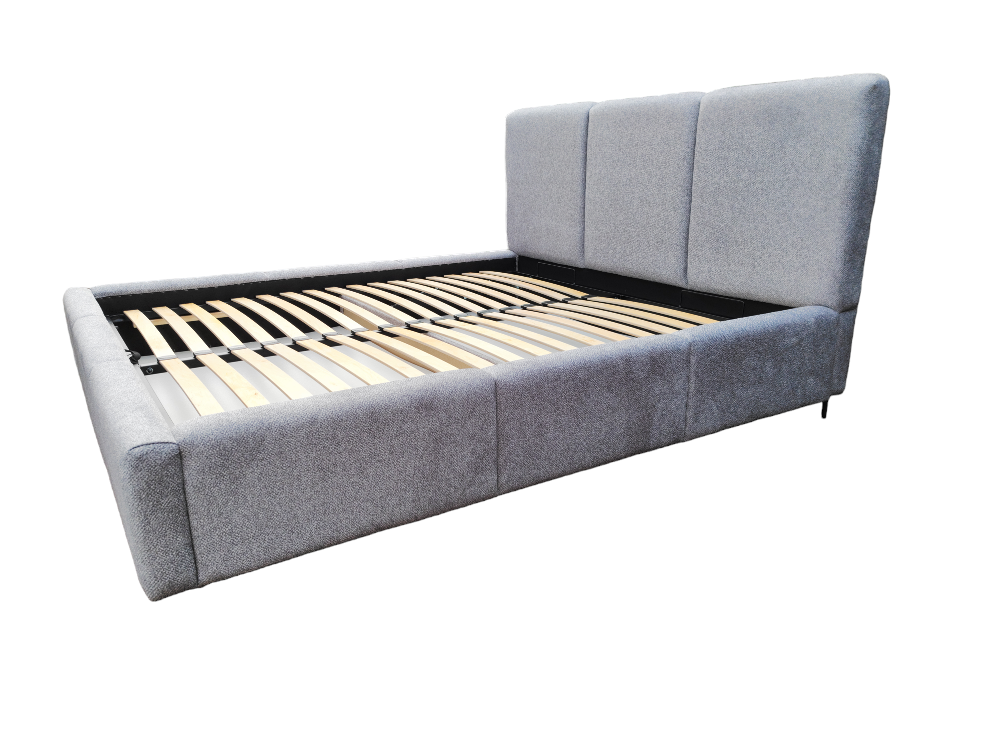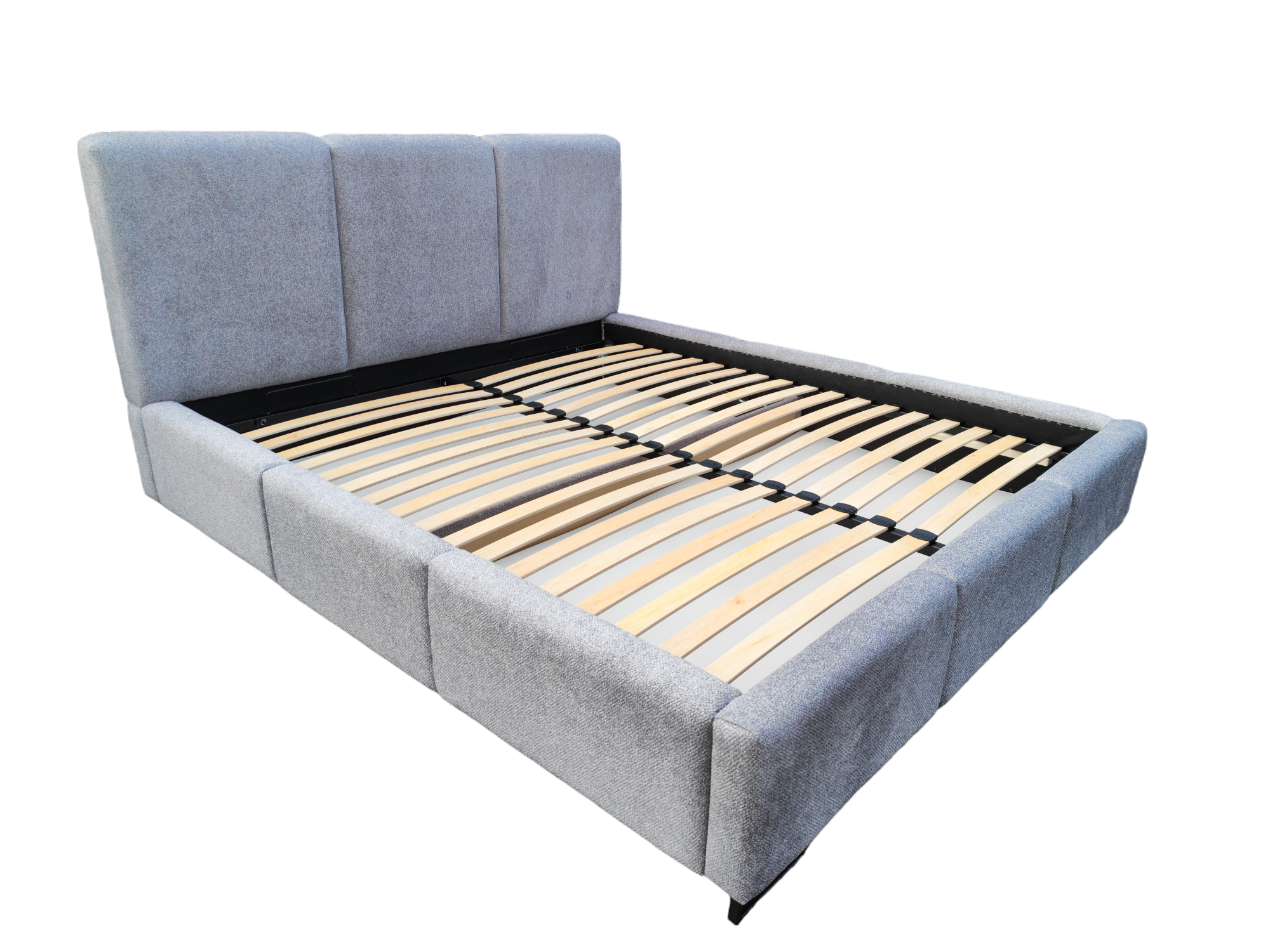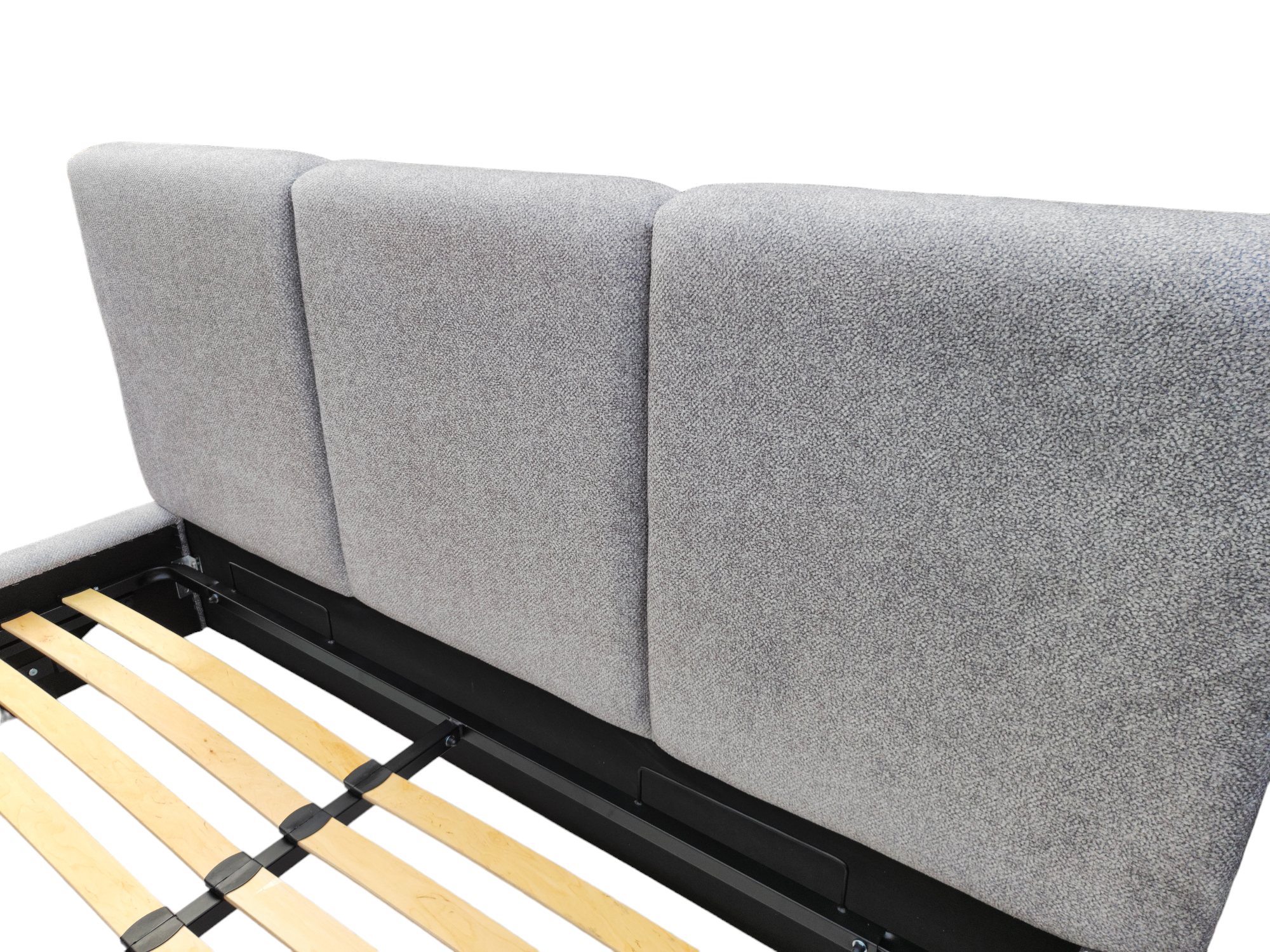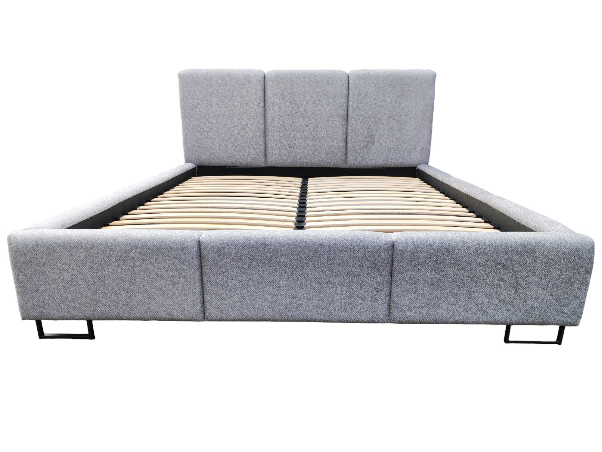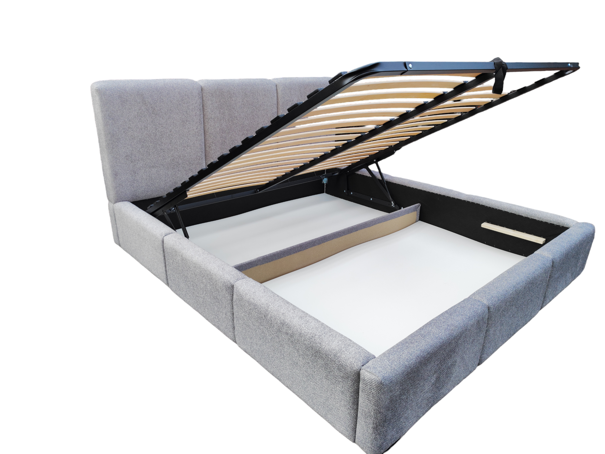 Łóżko z pojemnikiem na pościel z metalowym stelażem na siłownikach gazowych.