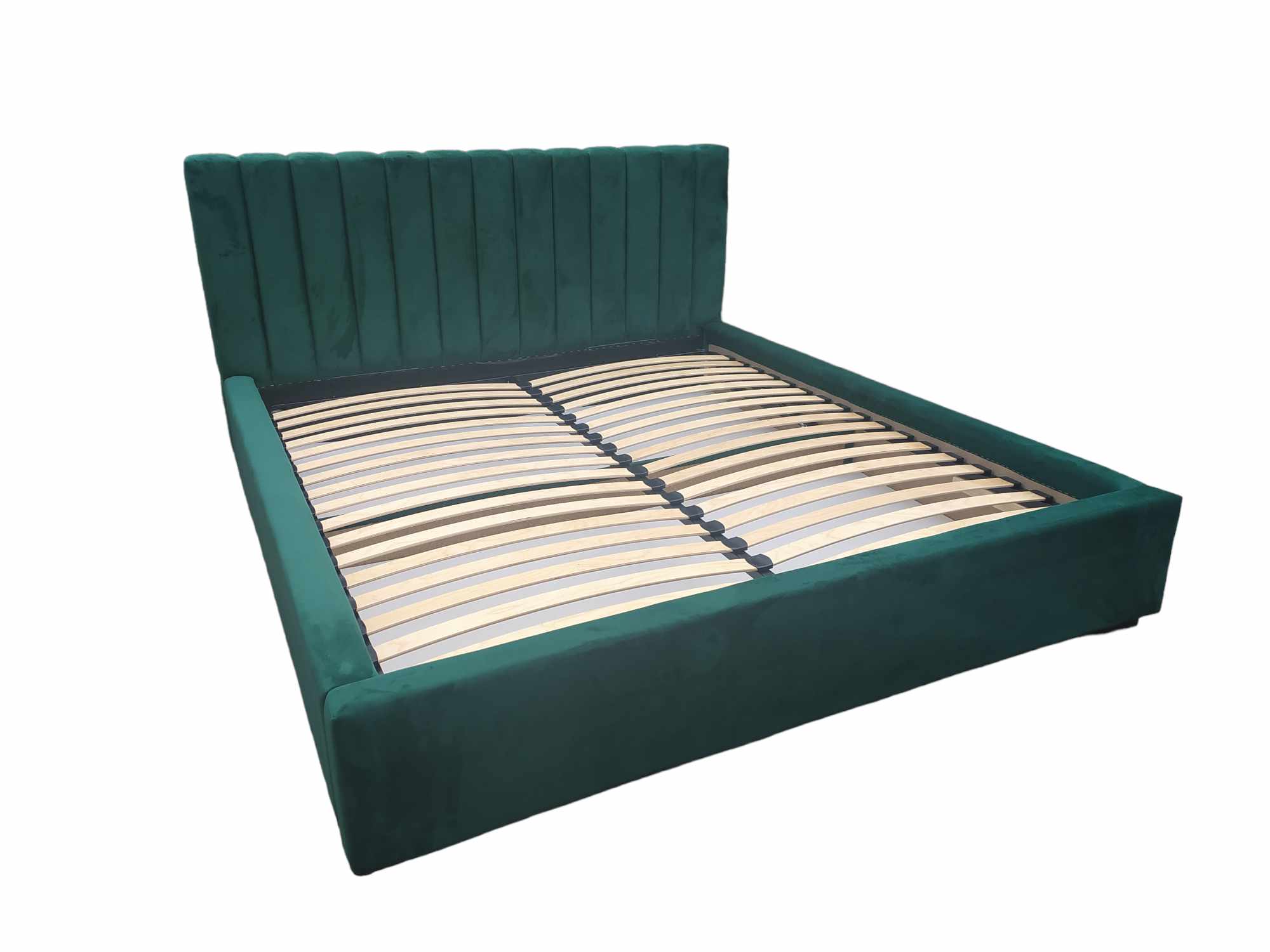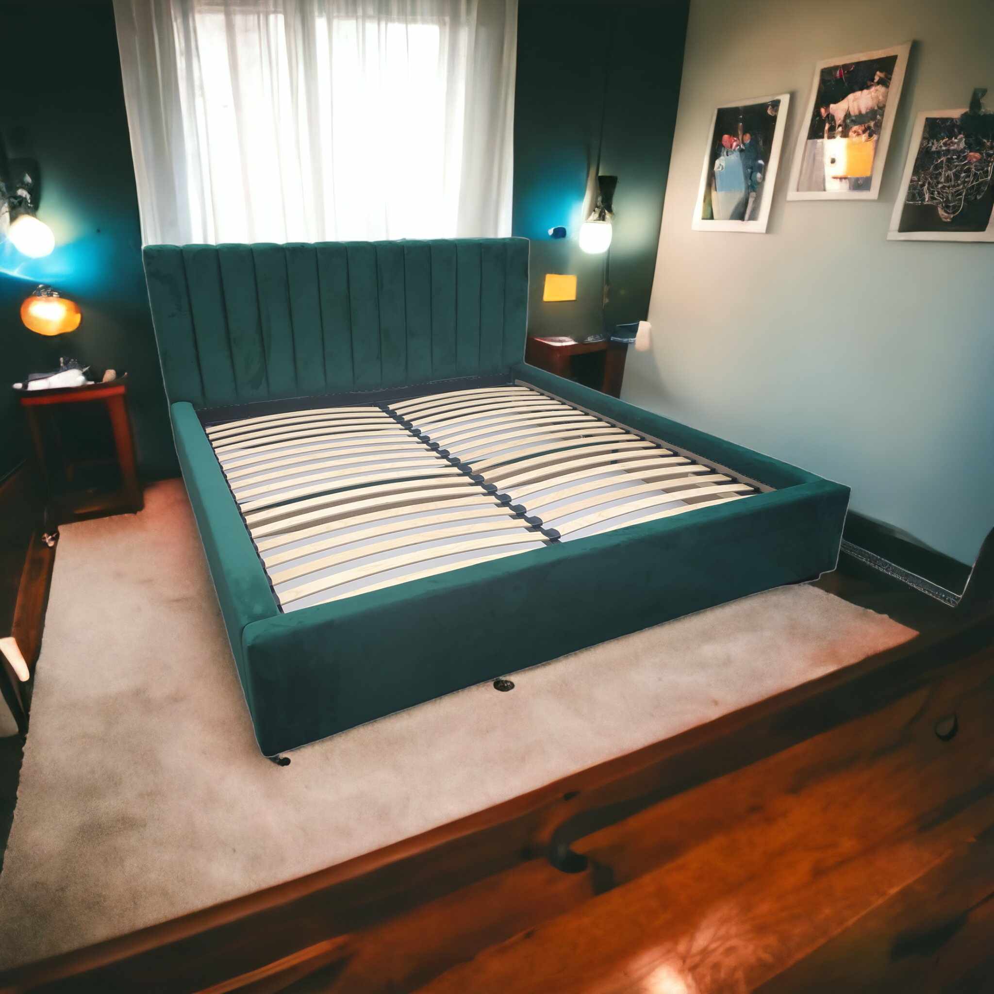 Łóżko Monza wykonane z tkaniny Royal Velvet w kolorze butelkowej zieleni.