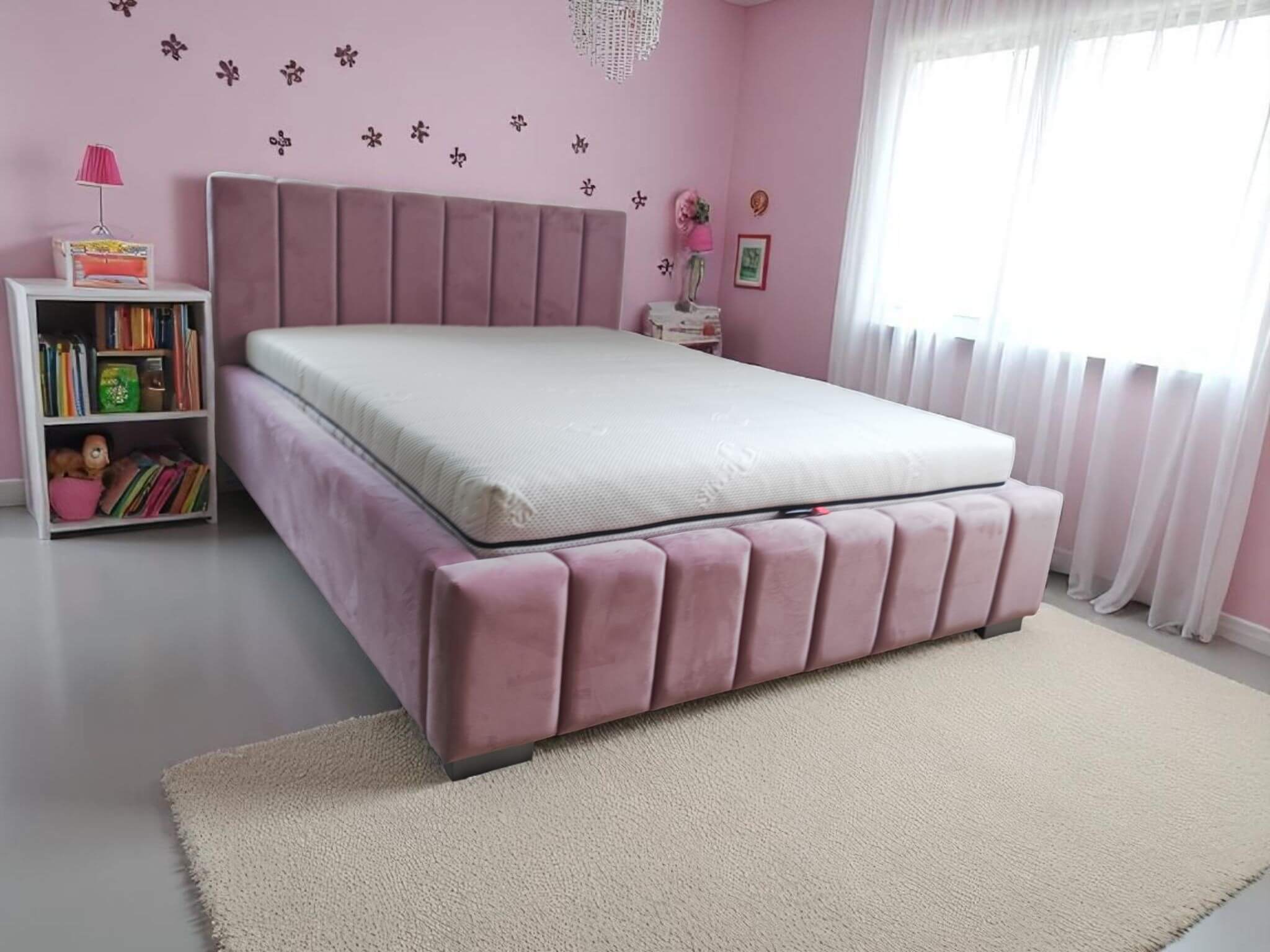 Model oferuje praktyczny pojemnik na pościel oraz solidny metalowy stelaż na siłownikach gazowych z giętymi listwami, który zapewnia komfort snu i umożliwia łatwe, bezpieczne podnoszenie materaca. Stabilna konstrukcja gwarantuje wygodę codziennego użytkowania i długą żywotność mebla.