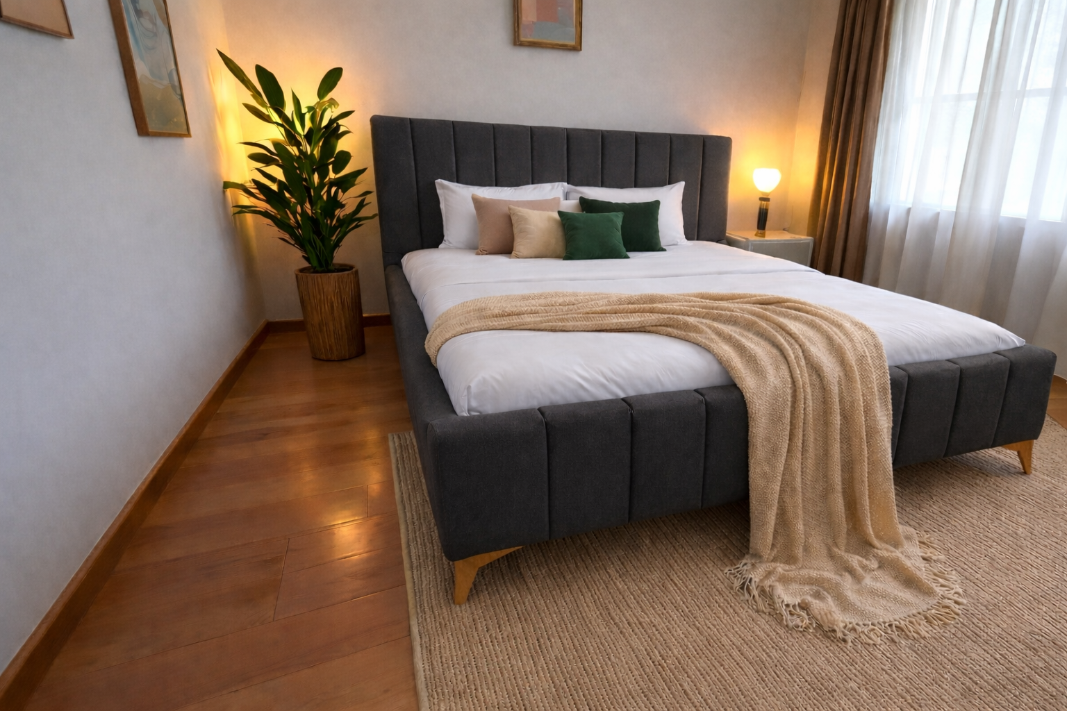 Łóżko tapicerowane MONZA II łączy elegancki wygląd z wysoką funkcjonalnością i doskonale sprawdza się w nowoczesnej sypialni. Producent wykorzystuje wysokiej jakości tkaninę Royal Velvet w dowolnym kolorze , która nadaje wnętrzu stylowy i ponadczasowy charakter. Pionowe panele tapicerowane na zagłówku oraz przodzie łóżka podkreślają nowoczesny design, a gładkie boki tworzą spójną, minimalistyczną formę.