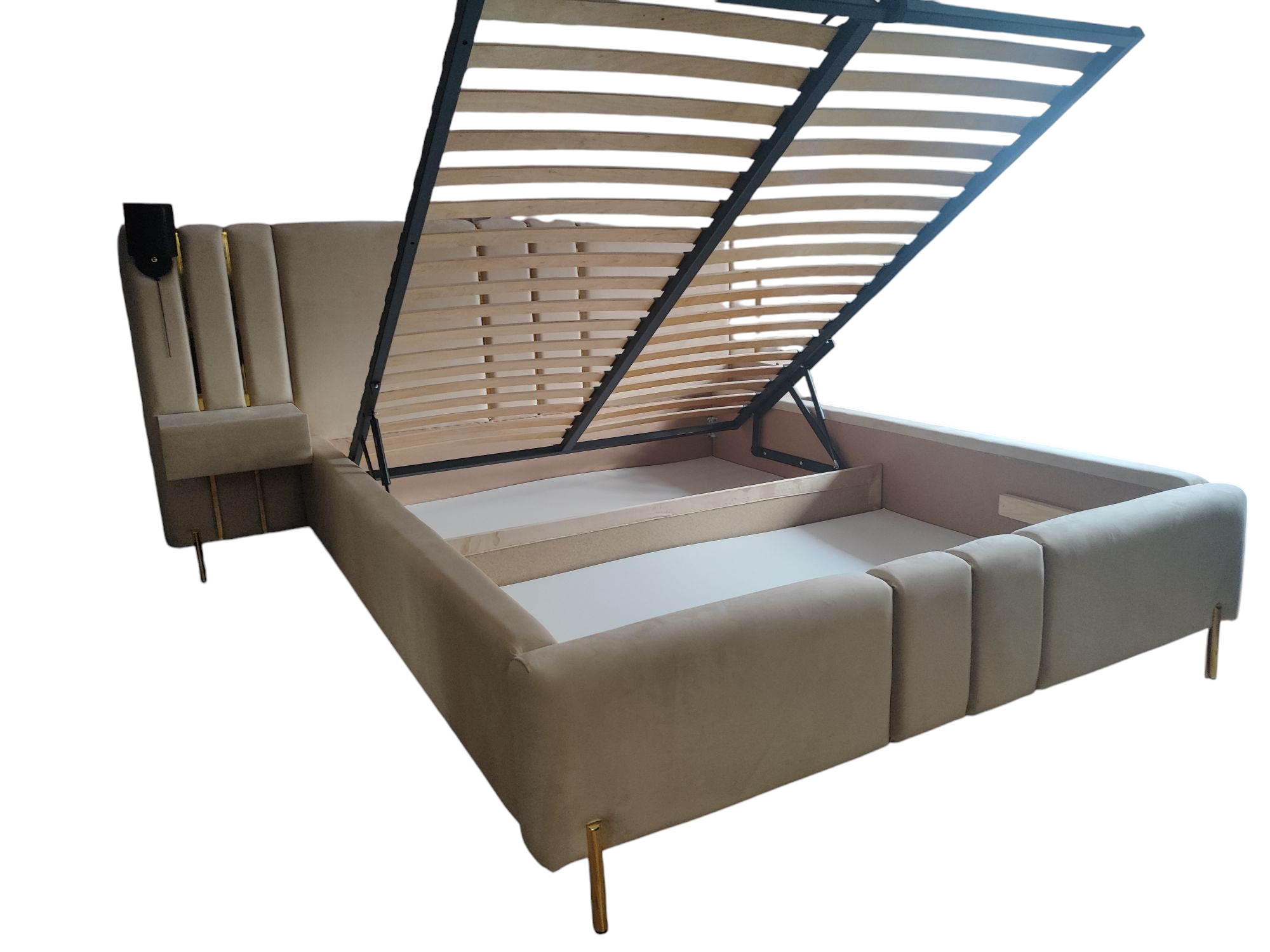 Łóżko wykonane zostało z miękkiej, welurowej tkaniny Royal Velvet, przyjemnej w dotyku i odpornej na codzienne użytkowanie. Posiada praktyczny pojemnik na pościel oraz metalowy stelaż na siłownikach gazowych, który ułatwia podnoszenie materaca.