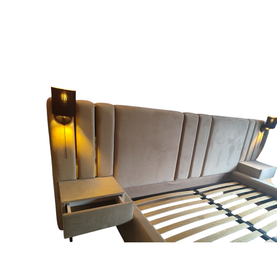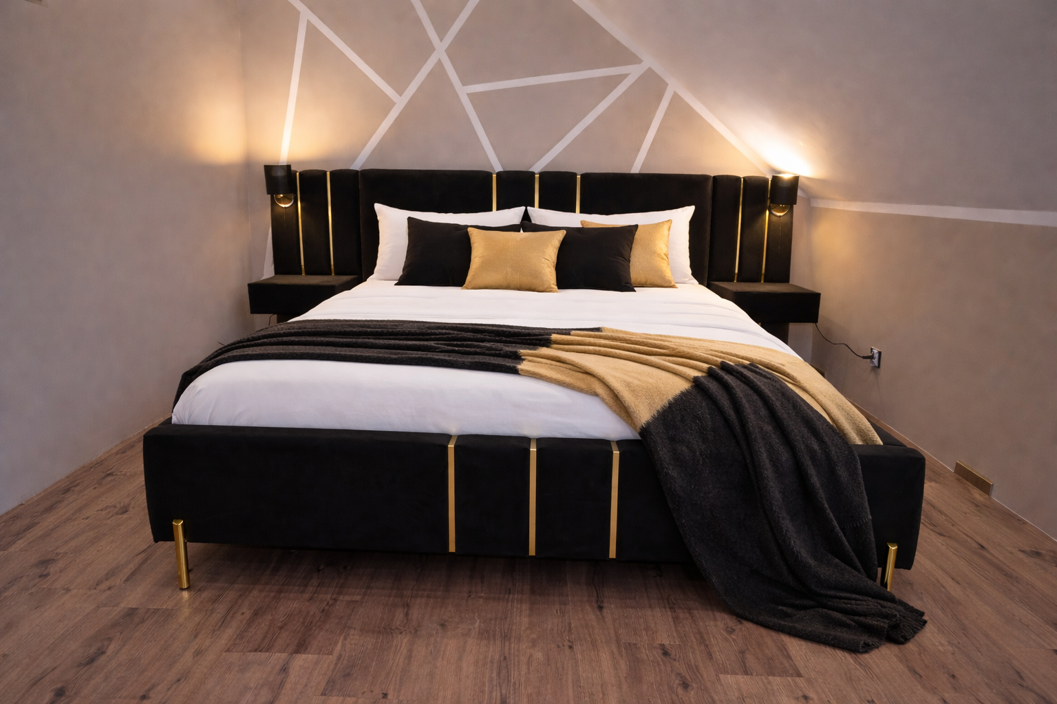 Dostawki pod szafki nocne i kinkiety również zostały wykończone złotą listwą, co nadaje całości spójnego i luksusowego charakteru. Łóżko można wykonać w dowolnej kolorystyce z dostępnego próbnika tkanin.
