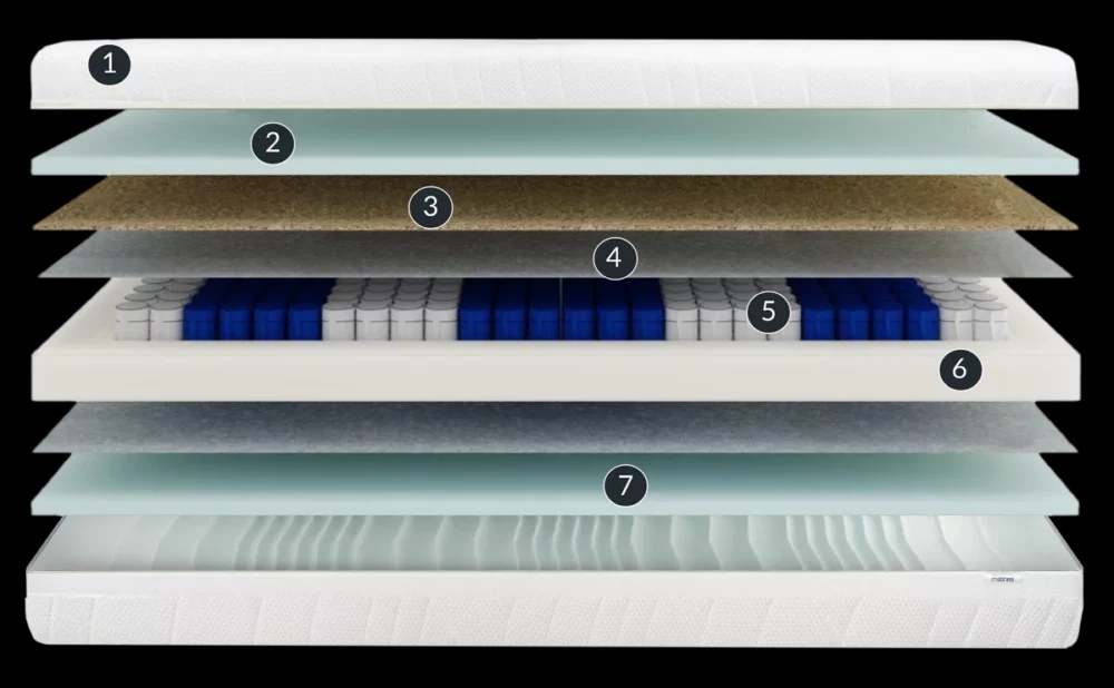 Strefowy wkład sprężynowy, składający się z sprężyny kieszeniowej. Każda ze sprężyn opakowana jest osobną kieszonką. system 7 stref nacisku sprawia , że cięższe odcinki ciała otrzymują mocniejsze podparcie.