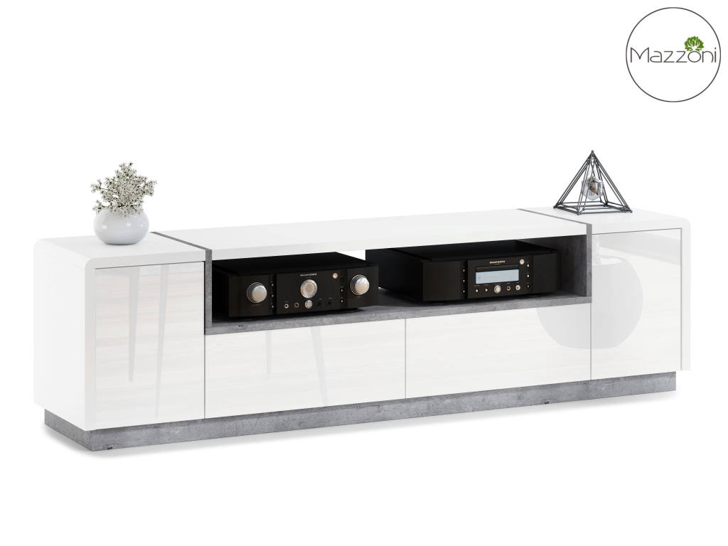 Elegancka szafka RTV 185 cm w połączeniu białego połysku i matowego betonu Millenium. Solidna konstrukcja z MDF i płyty wiórowej, matowy blat chroniony powłoką poliuretanową. Idealna do przechowywania sprzętu RTV i dekoracji – nowoczesny design, który odmieni każde wnętrze.