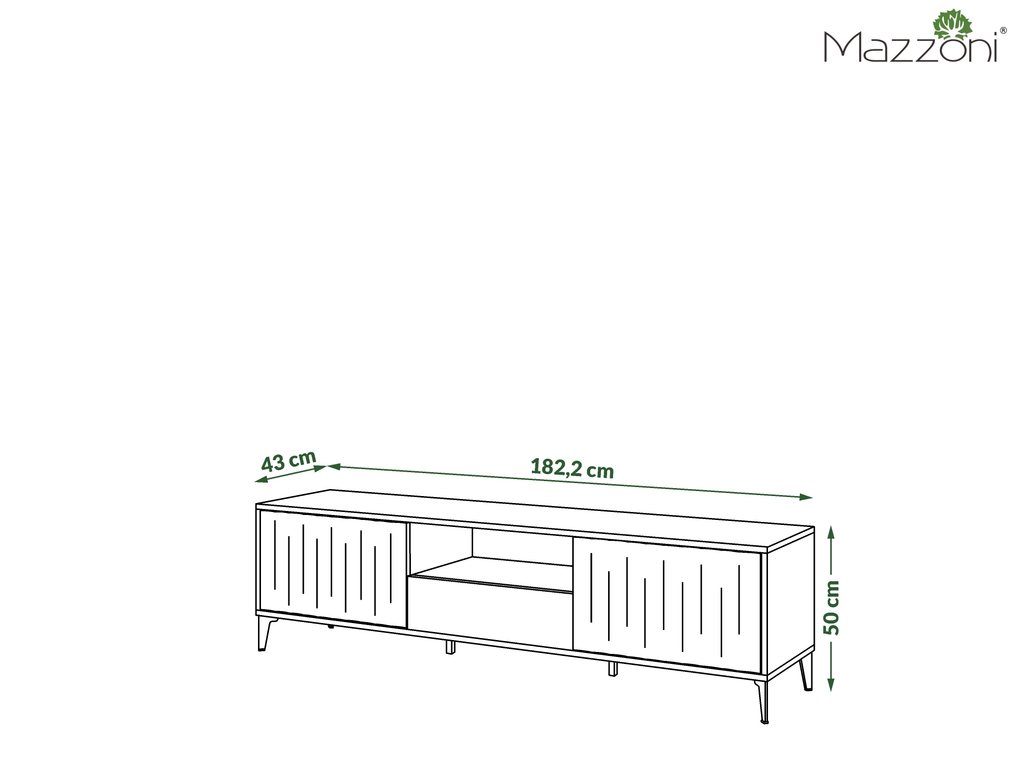 Szafka RTV RIMINI 182 to idealne połączenie nowoczesnego designu, funkcjonalności i solidnego wykonania. Dzięki dużej szerokości 182,2 cm, głębokości 43 cm i wysokości 50 cm, szafka zapewnia dużo miejsca na telewizor, sprzęt RTV oraz dekoracje.