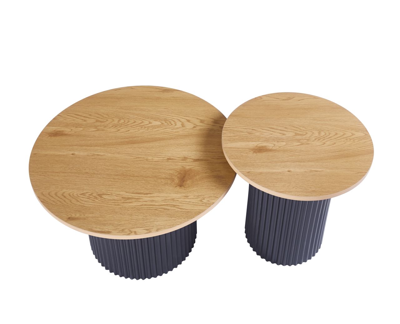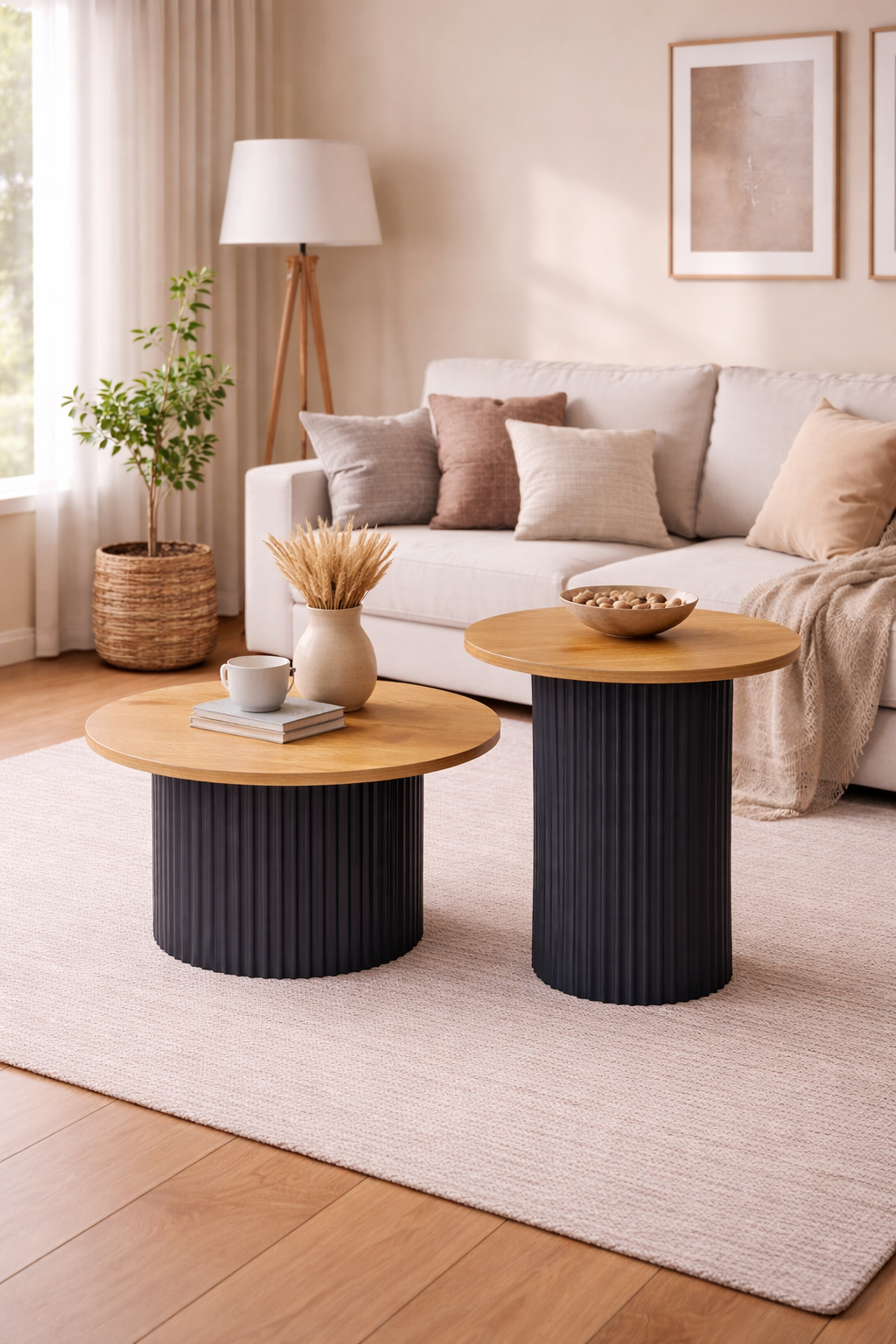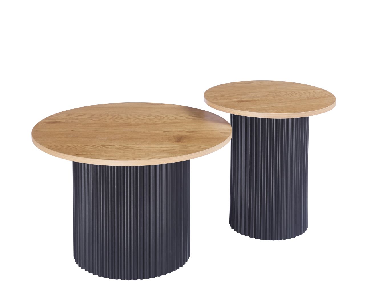 Dodaj styl i funkcjonalność do swojego salonu dzięki nowoczesnemu zestawowi dwóch stolików kawowych. Prosty design łączy naturalny wygląd drewna z eleganckim, czarnym stelażem, dzięki czemu stoliki pasują do wnętrz w stylu loft, skandynawskim i nowoczesnym.